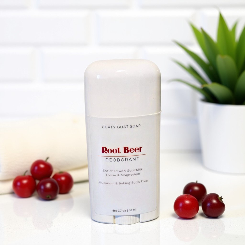 Stay fresh the natural way (99% natural), with our Root Beer Goat Milk and Tallow Deodorant! Our Goat Milk & Tallow Deodorant keeps you confidently odor-free all day—without the harsh chemicals. Smooth, creamy, and easy to apply, this deodorant glides on beautifully, absorbing moisture and neutralizing odor while nourishing your skin.